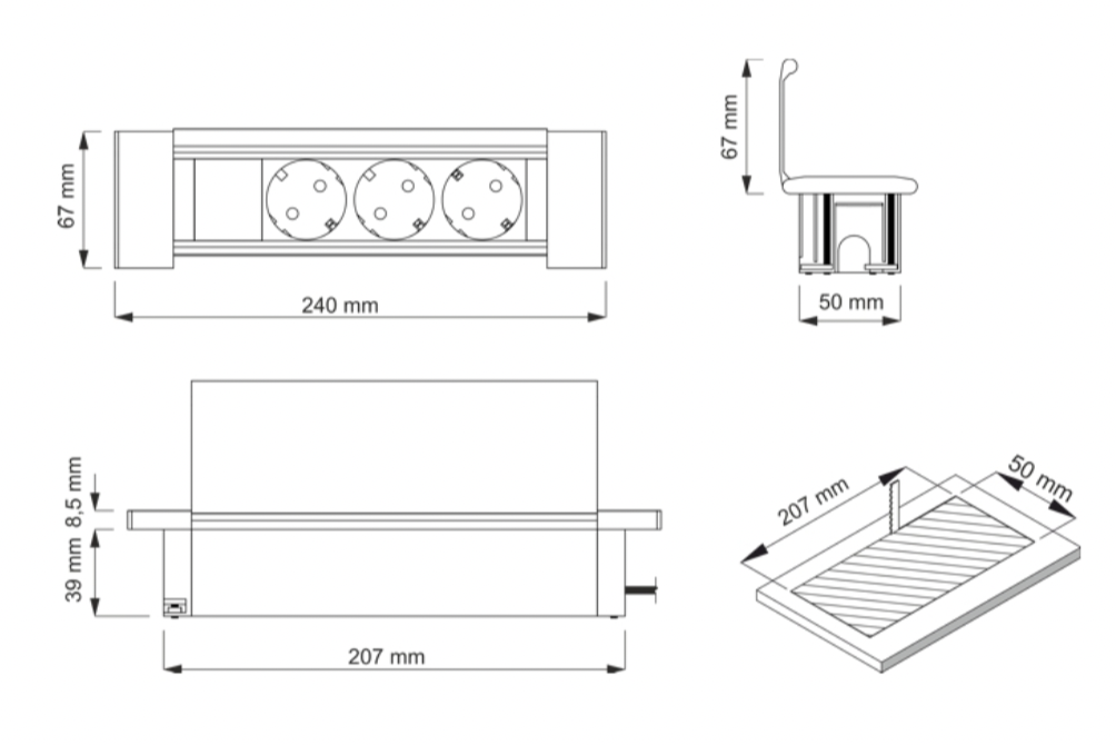 FLATBOX блок розеток горизонтальный 3xFrench Socket, 1.8м провод
